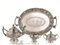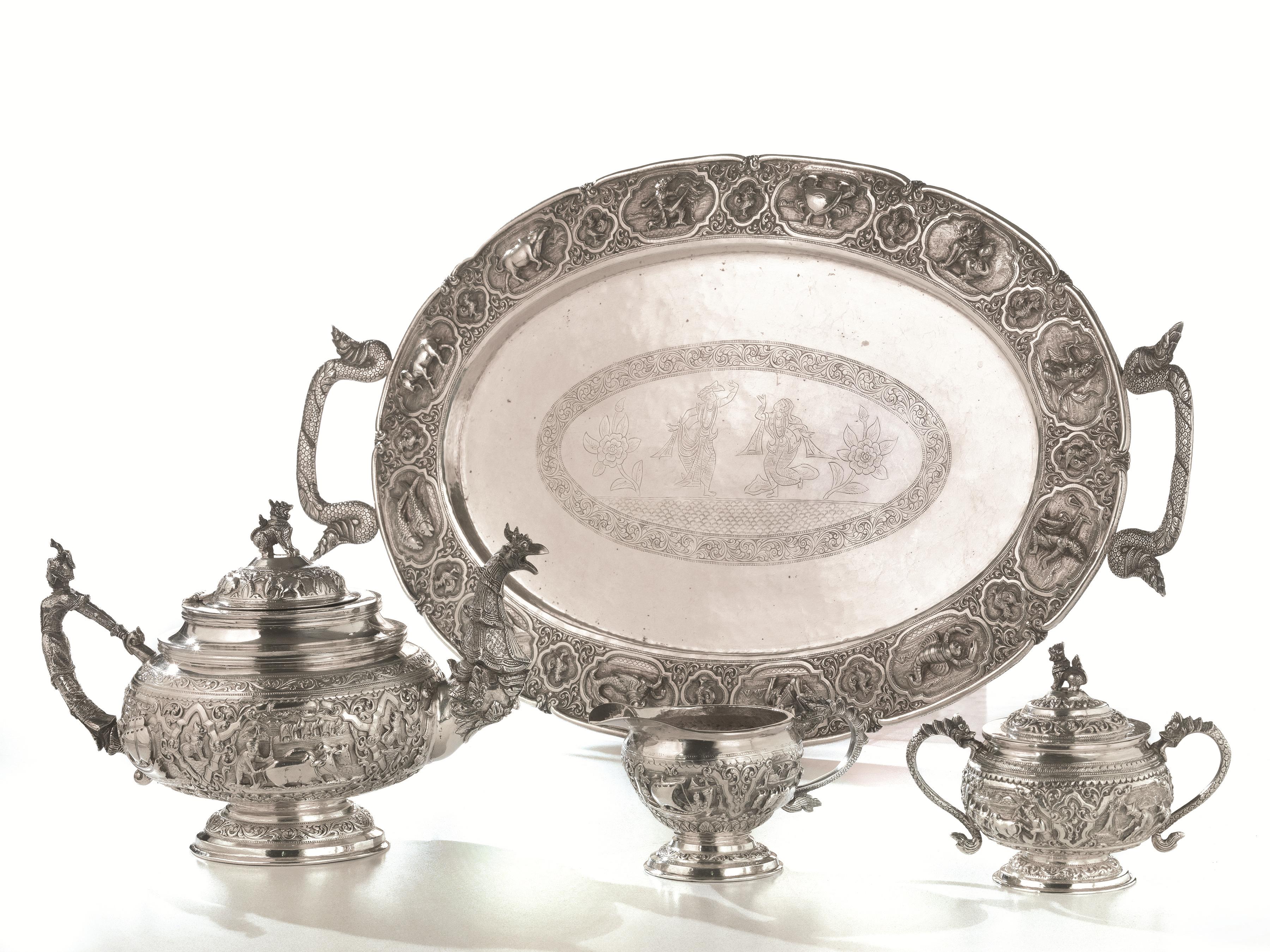 in argento riccamente sbalzato e cesellato con scene di genere con figure ed animali tra volute, composto di vassoio, teiera, lattiera e zuccheriera. Il vassoio è di forma ovale ed è decorato sul piano da scena di figure indiane danzanti, la teiera ha una presa realizzata come una figura in abiti indiani ed il beccuccio modellato ad animale fantastico, la zuccheriera e la lattiera hanno prese raffiguranti draghi; i finali dei coperchi sono modellati ad animali fantastici, g 4330 (4)