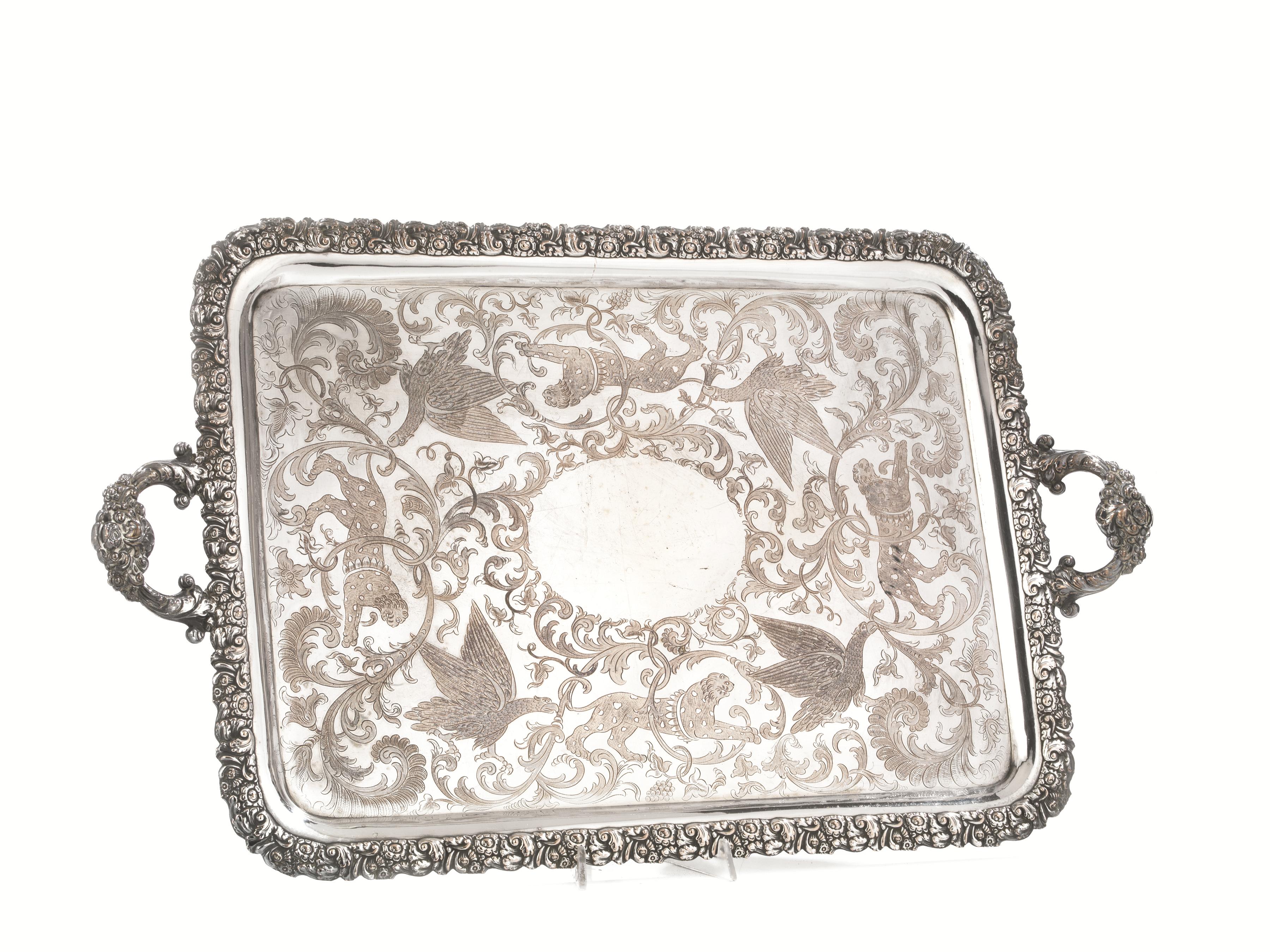 in rame argentato, di forma rettangolare, tesa decorata da volute e fiori, piano inciso a fiere e volatili tra racemi, due anse a tralci contrapposti, cm 70x42