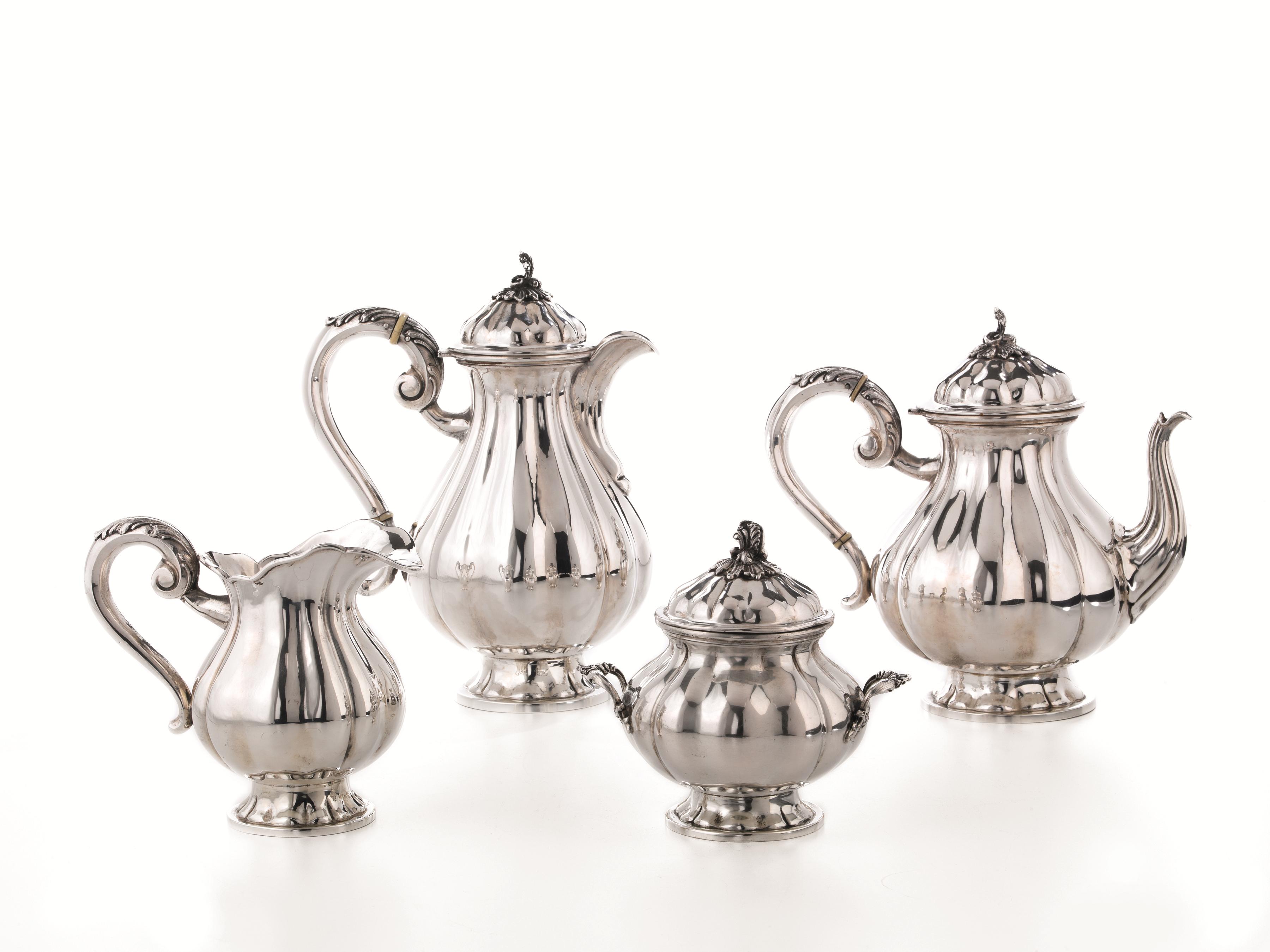 in argento sbalzato, composto di teiera, caffettiera, lattiera e zuccheriera, complessivi g 2760 (4)