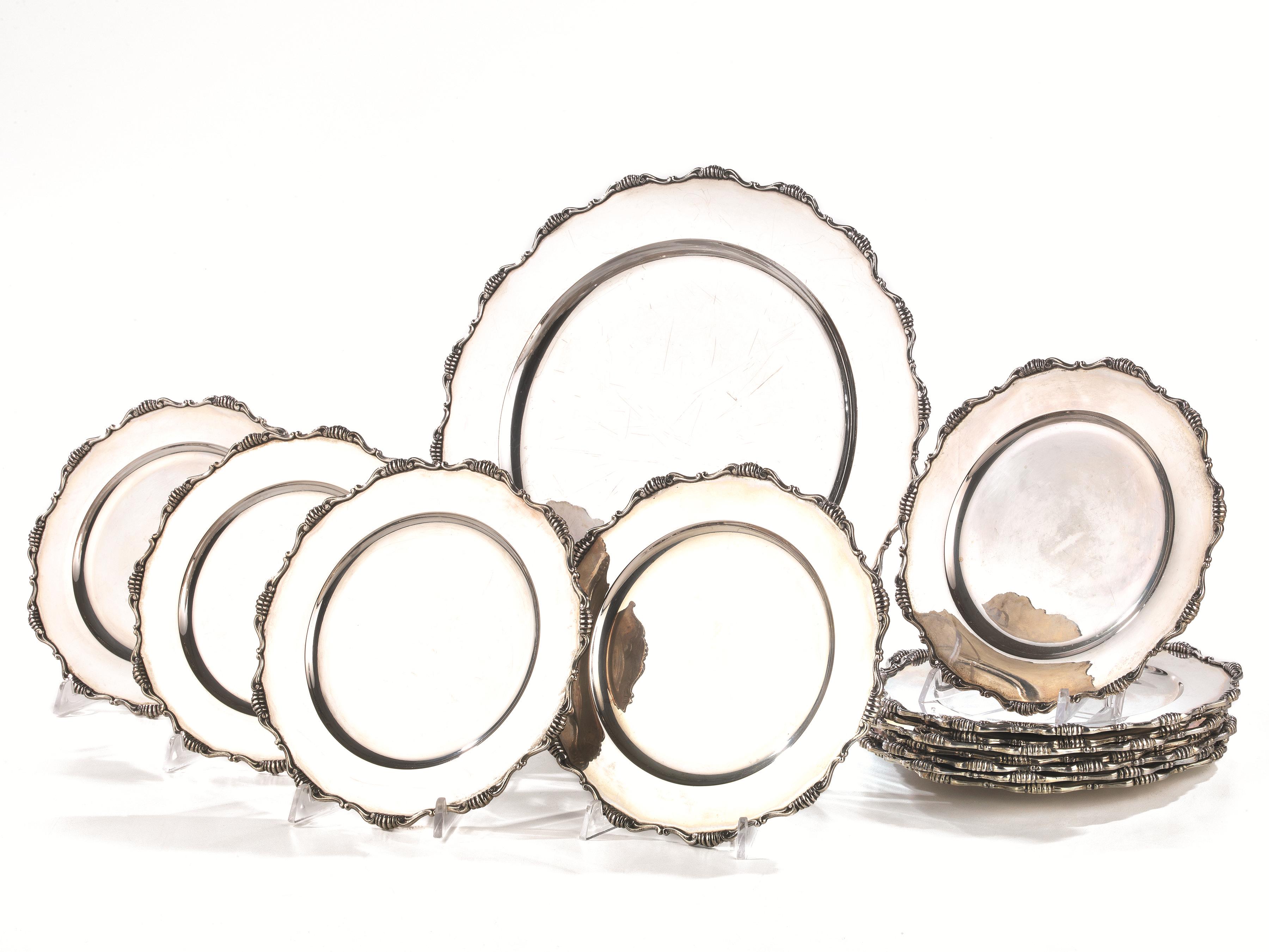 DODICI PIATTI DA FRUTTA ED UN VASSOIO CIRCOLARE, SECOLO XX, ARGENTIERE MELLI