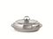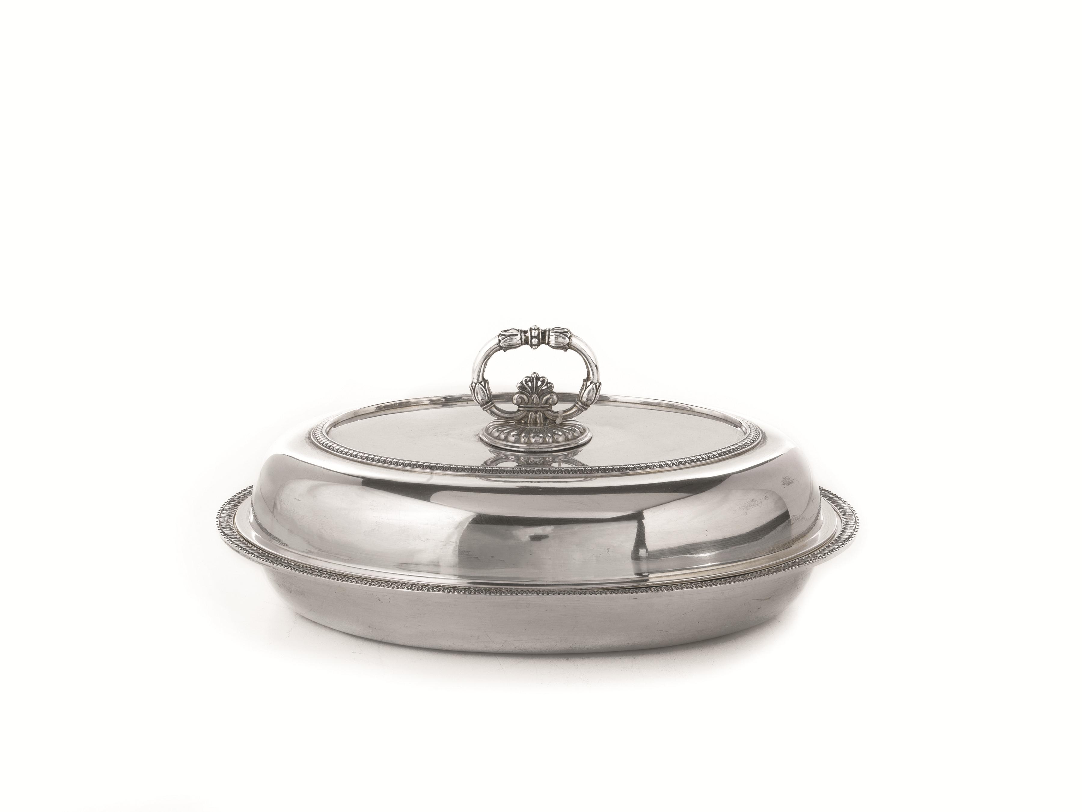 di forma ovale, inargento con profili a foglie lanceolate, presa del coperchio a volute contrapposte, g 1250