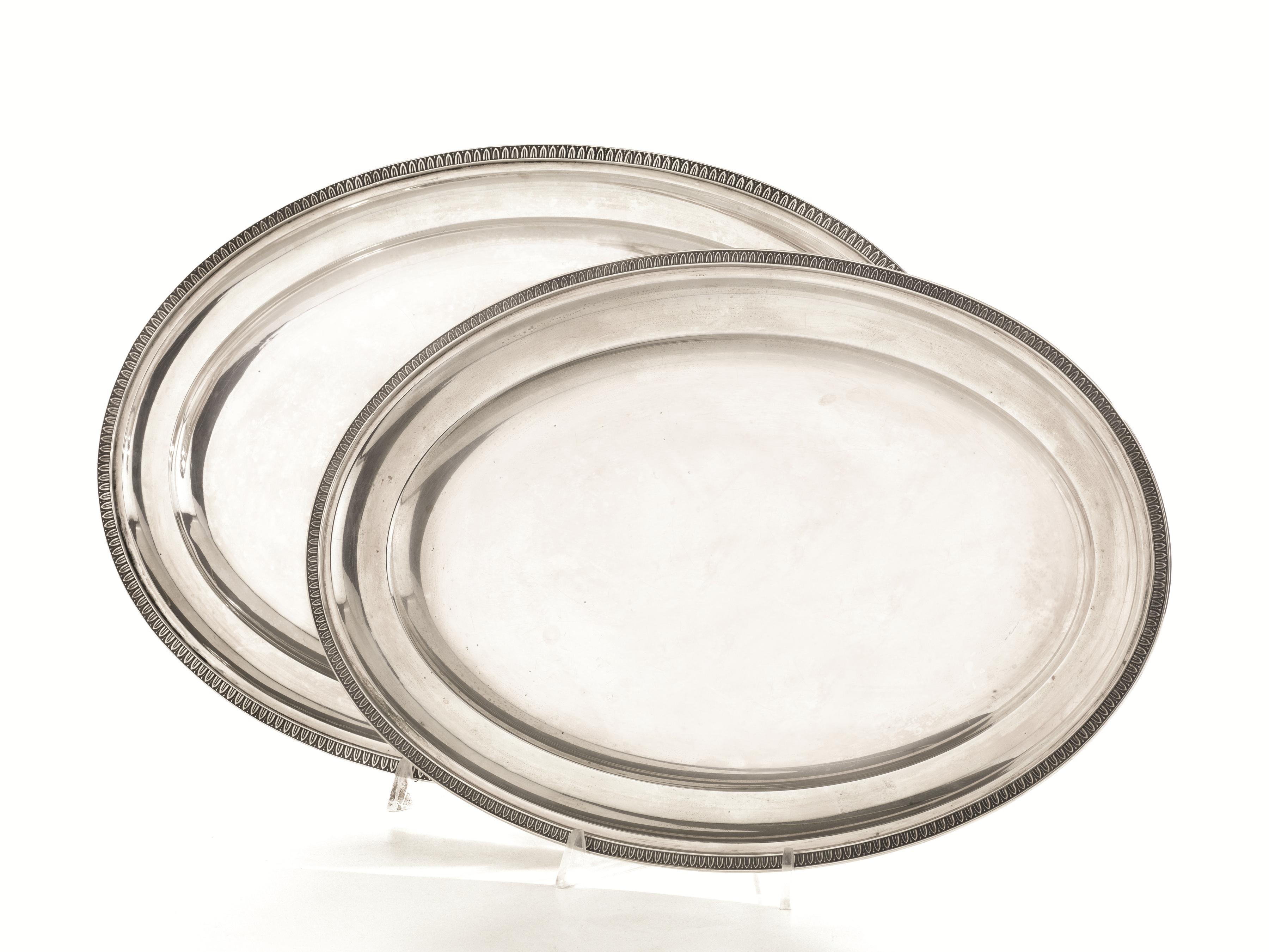 in argento, di forma ovale, tesa decorata da foglie lanceolate, cm 41,5x28,5 e cm 46,5x32,5, complessivi g 1780 (2)