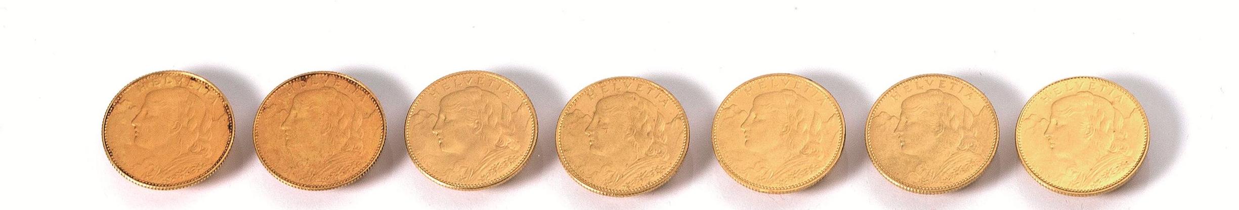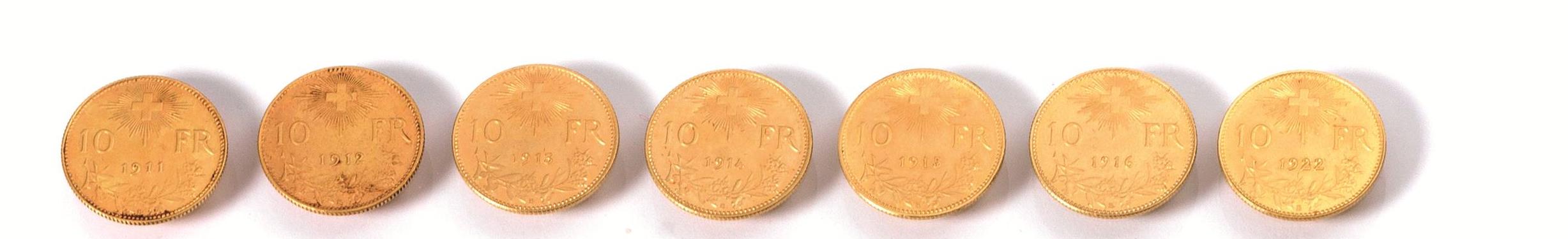 LOTTO DI SETTE MONETE IN ORO (7):serie completa da 10 franchi svizzeri, 1911,...