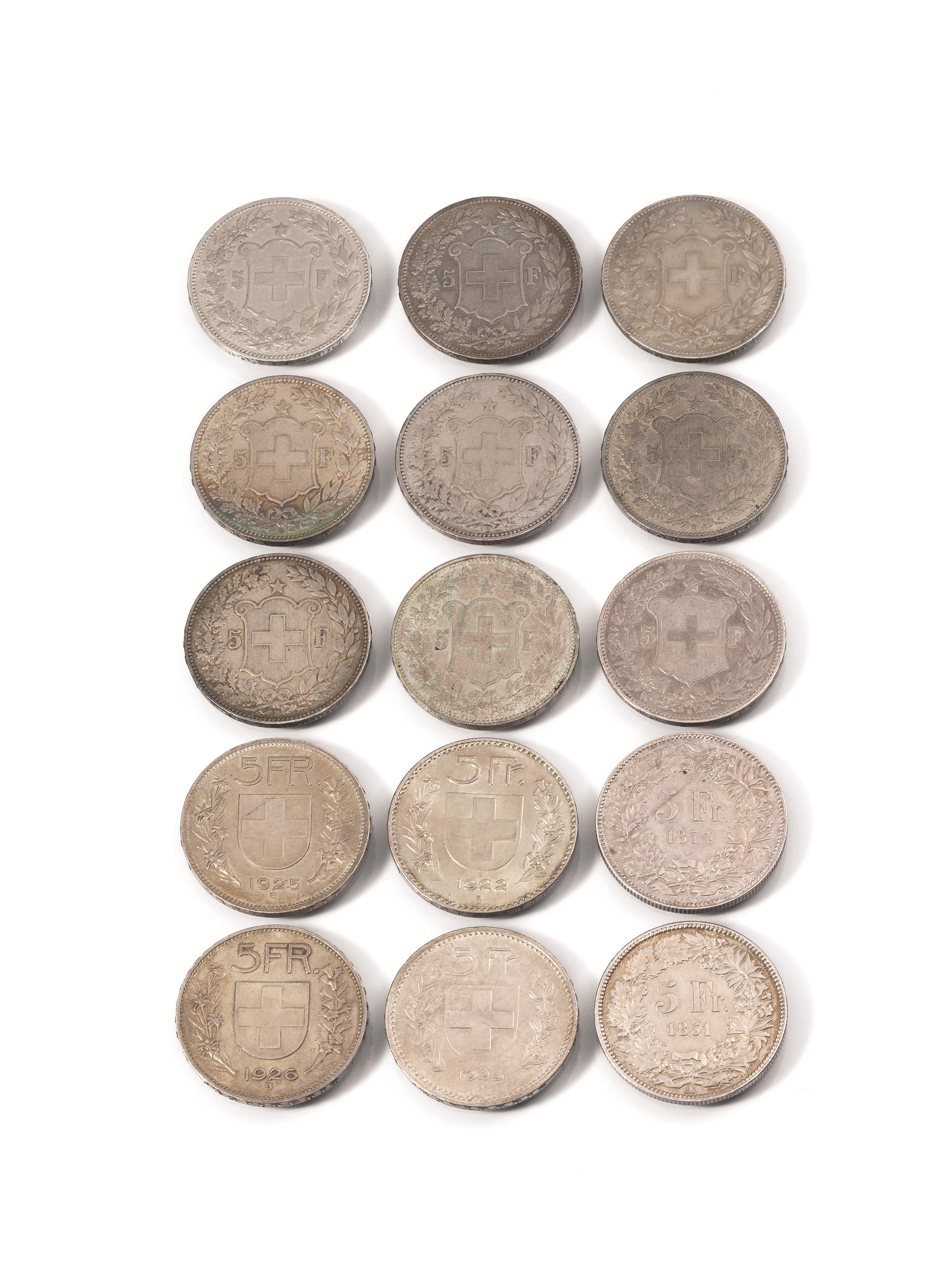SVIZZERA, LOTTO DI QUINDICI MONETE DA 5 FRANCHI (15):