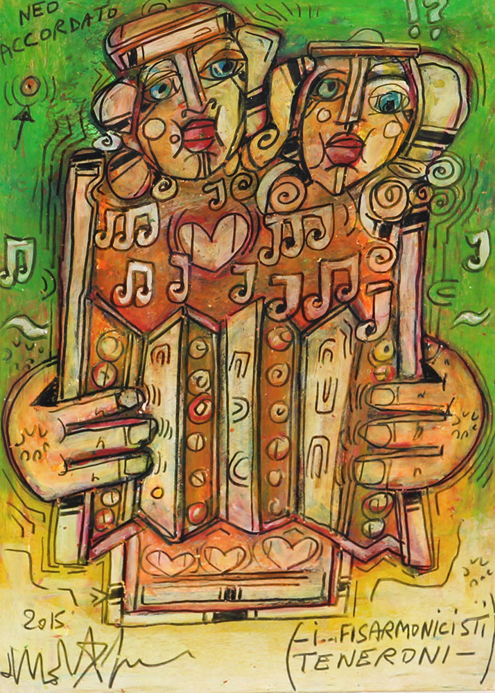 Delego Martino I… Fisarmonicisti Teneroni, 2015 tecnica mista su carta, cm. 29,5x21 firmata e datata in basso a sinistra, intitolata in basso a destra, firmata e datata al retro senza cornice