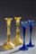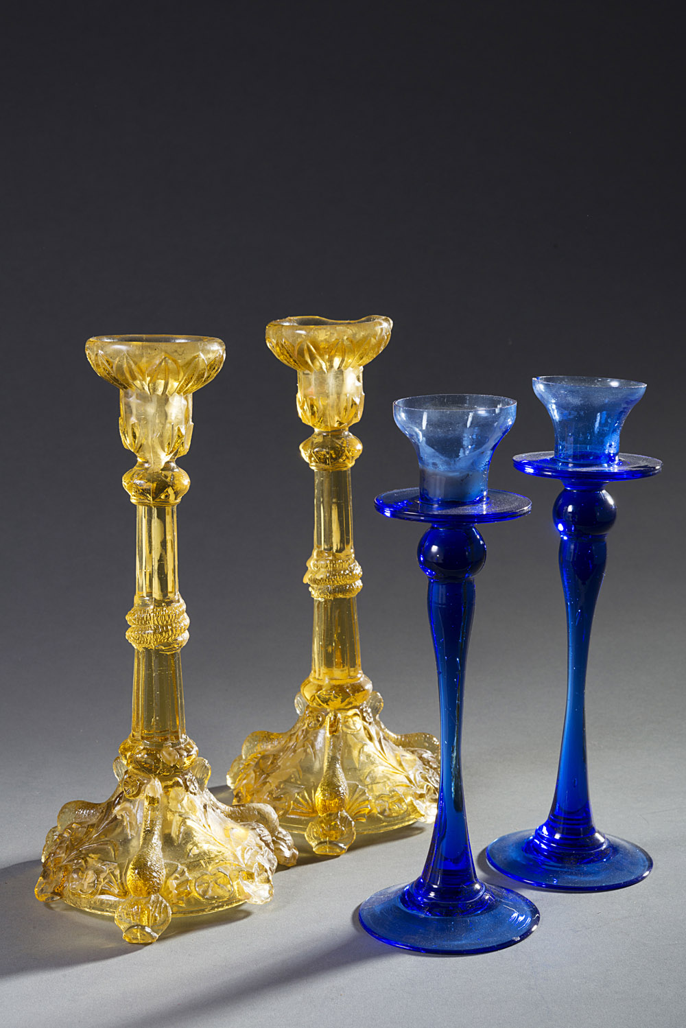 Manifatture diverse: lotto composto da due coppie di candelieri in vetro giallo e blu (misure diverse ) (difetti) Various manufactures: lot comprising two pairs of candlesticks (different measures) (defects)