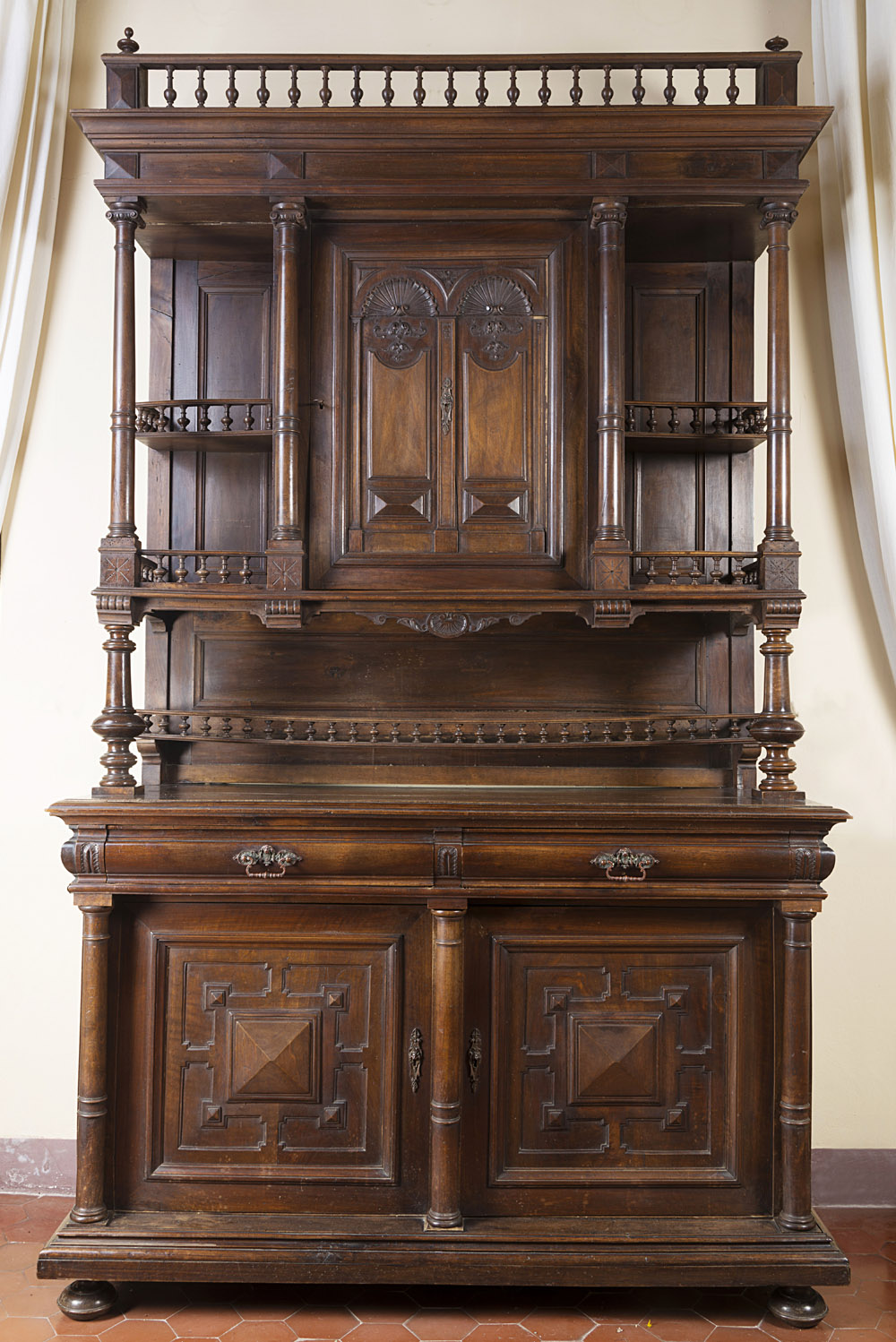 Mobile a due corpi in noce con parte superiore ad un'anta e ripiani a giorno decorati con ringhiere tornite, parte inferiore a due cassetti e due sportelli con montanti a colonna a tutto tondo. Piedi a cipolla. Inizio del sec. XX (cm 154x260x62) (difetti) Walnut wood cabinet. Early 20th century (defects)