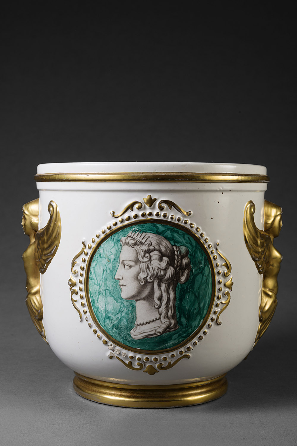 Manifattura Zaccagnini 1940 circa Rinfrescatoio in ceramica decorato con figure alate dorate, fregi in rilievo e riserva a finto marmo contenente profilo femminile a grisaille (cm 17x16,5)(lievi difetti) Manufacture of Zaccagnini, circa 1940. Ceramic cooler (minor defects)