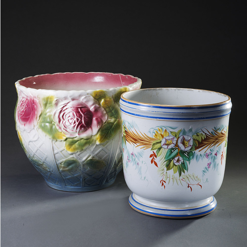 Manifattura francese inizio del sec. XX Lotto composto da due cachepot in ceramica policroma ed in rilievo a fiori (misure diverse) French manufacture, early 20th century. Lot comprising two ceramic polychrome jardinières (different sizes)