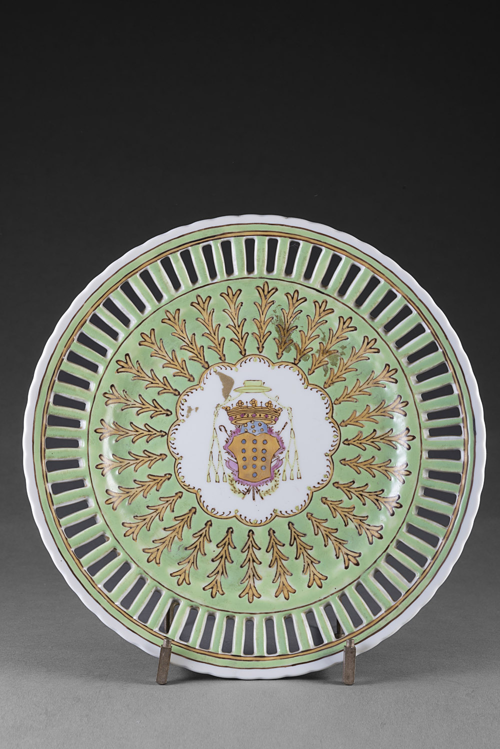 Manifattura del sec. XX Gruppo di sei piatti in porcellana a fondo verde con volute e stemma cardinalizio policromi. Bordo traforato (diam cm 25) (difetti) Manufacture of the 20th century. Group of six porcelain plates with pierced borders (defects)