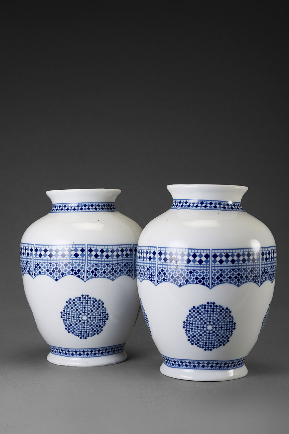 Manifattura marocchina coppia di vasi portafiori globulari in ceramica nei toni del blu con motivi geometrici (h cm 21) (difetti e restauri) Moroccan manufacture. Pair of globular vases (defects and restorations)