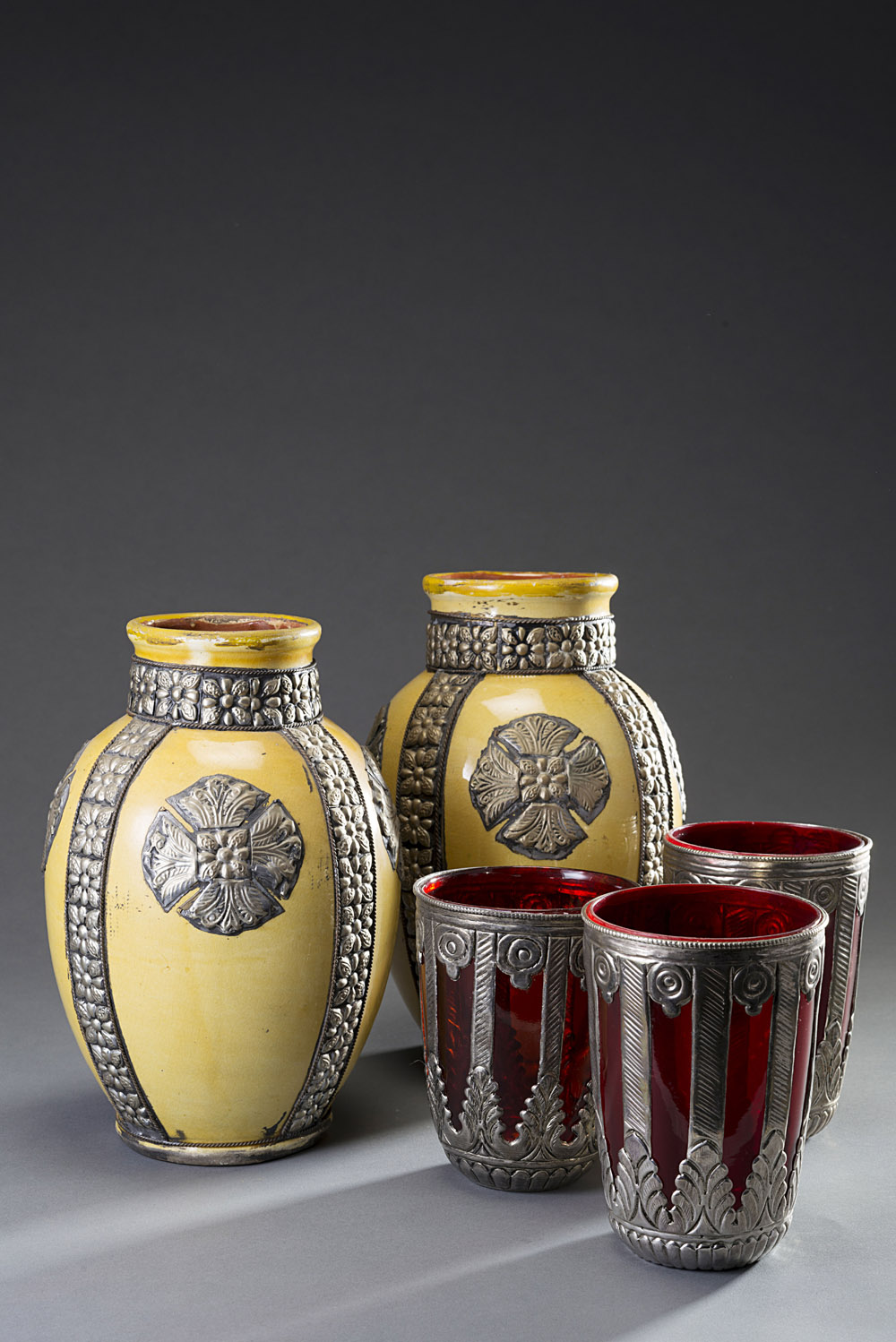 Manifattura orientale. Lotto composto da quattordici bicchieri in vetro rosso con ghiere in metallo sbalzato e due vasi in ceramica gialla decorati con applicazioni in metallo Oriental manufacture. Lot comprising fourteen red glasses with embossed metal borders and two ceramic vases
