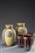 Manifattura orientale. Lotto composto da quattordici bicchieri in vetro rosso con ghiere in metallo sbalzato e due vasi in ceramica gialla decorati con applicazioni in metallo Oriental manufacture. Lot comprising fourteen red glasses with embossed metal borders and two ceramic vases