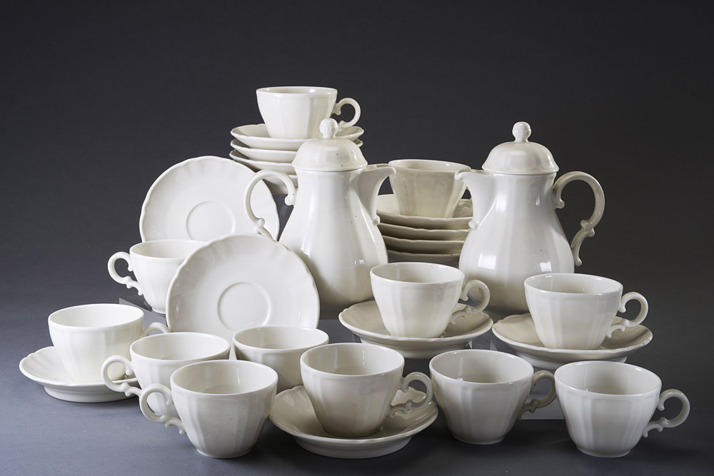 Manifattura tedesca Servizio da caffè in porcellana bianca composto da dodici tazzine con piattini e due caffettiere German manufacture. White porcelain coffee set comprising twelve cups and saucers and two coffee pots