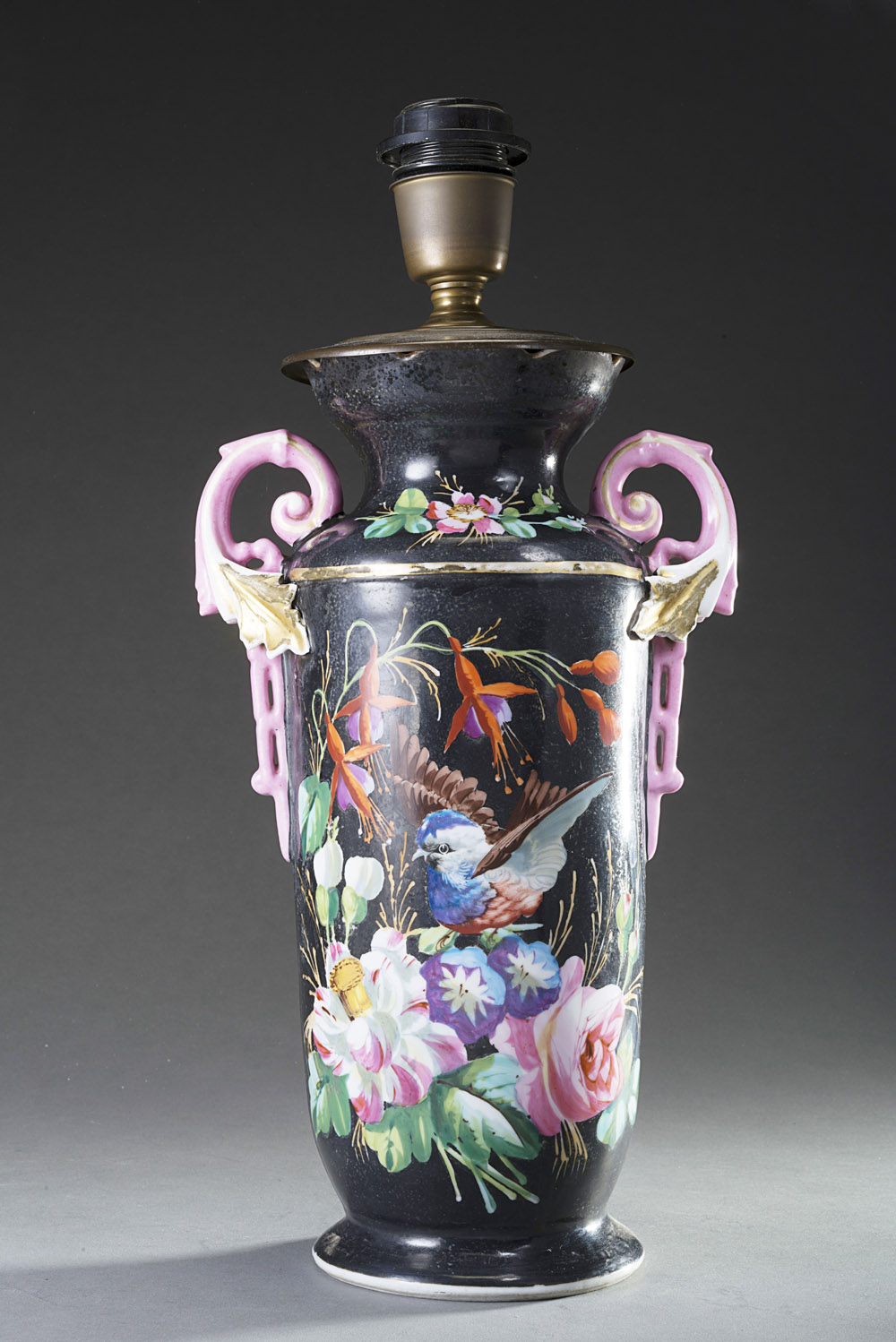 Manifattura francese sec. XIX Vaso in porcellana a fondo nero con volatili e fiori policromi e dorature. Anse a decoro geometrico e foglie dorate (h cm 34) (montato a luce elettrica in epoca posteriore) (lievi difetti) French manufacture, 19th century. Porcelain vase (mounted as electric light in later period) (minor defects)