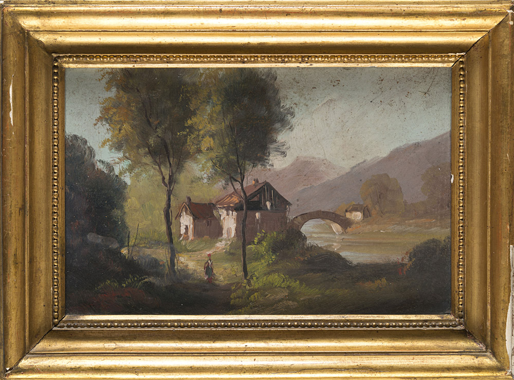 Ignoto inizio del sec. XX 'Paesaggio fluviale con cascine e figura' olio su masonite (cm 18x27) In cornice di legno e pastiglia dorata (divetti) Author unknown, early 20th century. "Fluvial Landscape with Farm Houses", oil on masonite