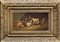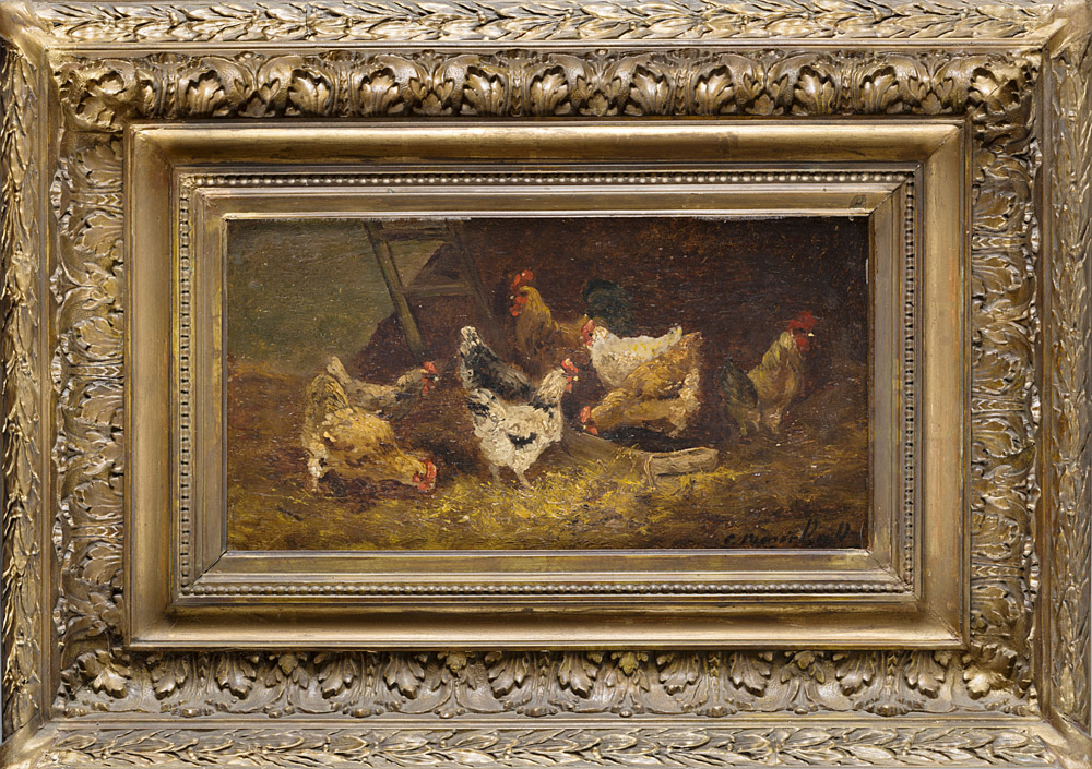 Firma indecifrata 'Galline e polli nell'aia' olio su tavola (cm 21x41) firmato ed iscritto in basso a destra. In cornice di legno e pastiglia dorata Undeciphered signature "Chickens and Hens in the Farmyard", oil on panel. Signed and inscribed at bottom right. Giltwood Frame