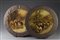 Coppia di piatti in latta decorati con scene di caccia entro cornici di ferro battuto a rilievo con mascheroni, figure mitologiche e frutta. Inizio del sec. XIX (diam. cm 41) (difetti) Pair of decorated tin plates. Early 19th century (defects)