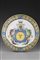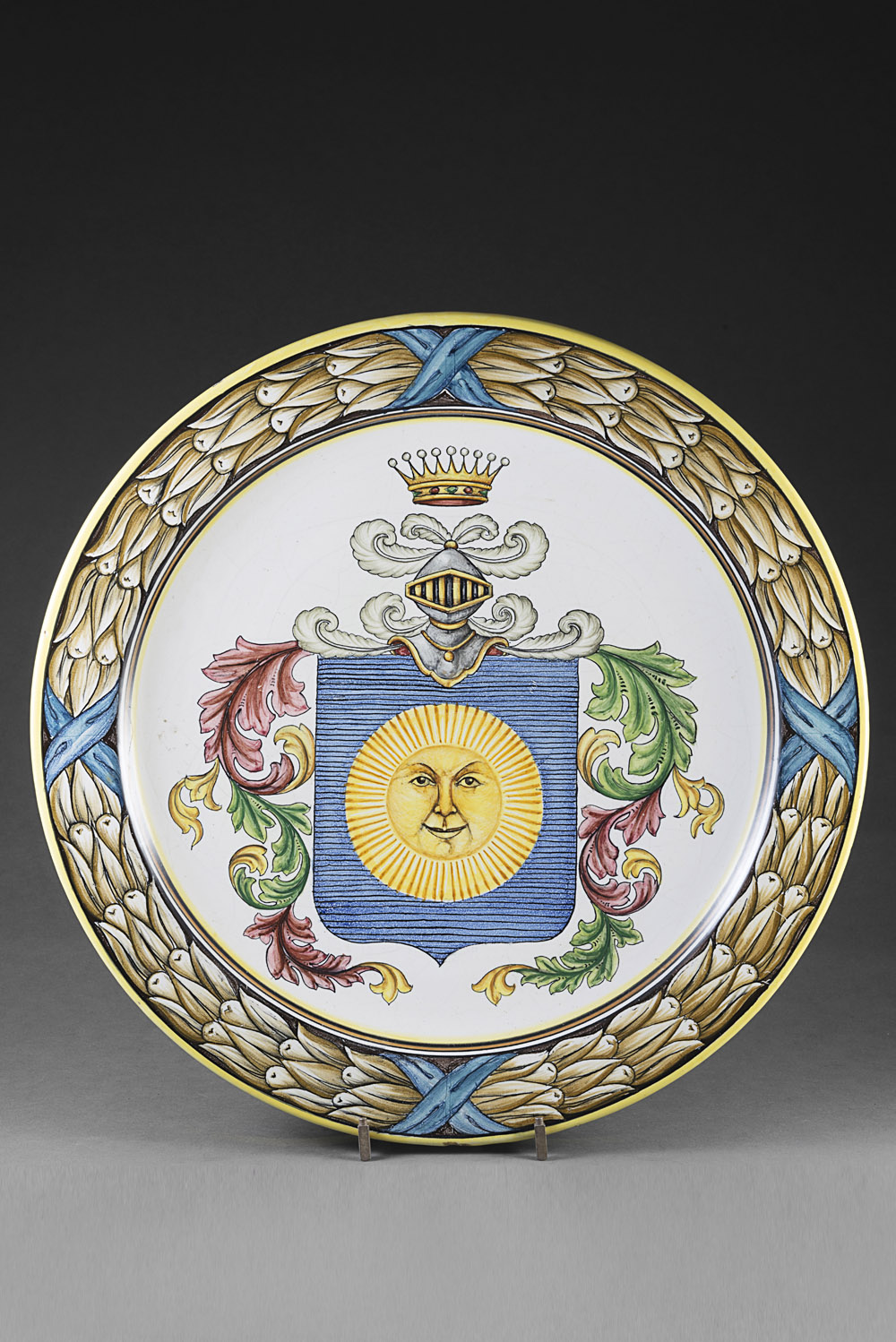 Manifattura italiana Piatto in maiolica bordato di giallo, falda con foglie e frutti intervallati da nastri ; cavetto centrato da stemma nobiliare (diam. cm 46,5) (difetti e restauri) Italian manufacture. Majolica plate centered by coat-of-arms (defects and restorations)