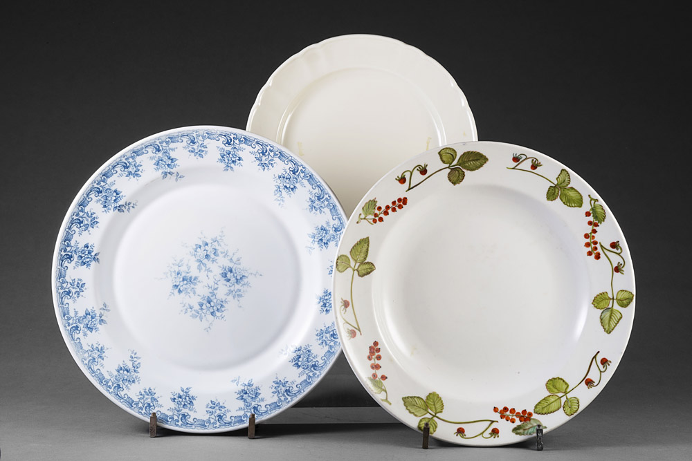 Gruppo di cinque piatti in ceramica di diversa misura e decoro (difetti) Set of five ceramic plates of different sizes and decoration (defects)