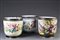 Manifattura italiana Tre cachepot in ceramica bordata di nero e decorati in policromia con mazzi di fiori (h cm 18 e 17) (difetti e restauri) Italian manufacture. Three ceramic jardinières (defects and restorations)