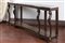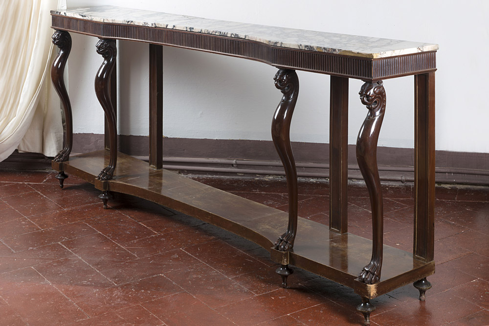 Consolle di forma mossa con piano in alabastro, fascia scanalata sorretta da montanti intagliati a teste leonine terminanti a piedi ferini poggianti su mensola con sostegni torniti. Inizio sec XX (cm 233x103x30) (difetti e restauri) Shaped console table with alabaster top. Early 20th century (defects and restorations)