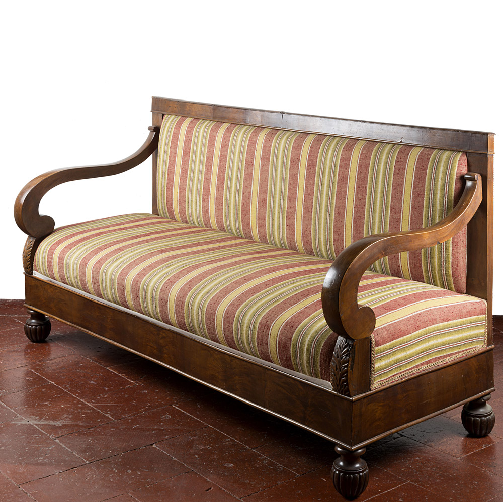 Divano in noce con schienale squadrato, montati a ricciolo intagliati all'attacco a volute fogliate. Piedi torniti e scanalati. Sec. XIX (cm 166) Walnut-wood sofa. 19th century