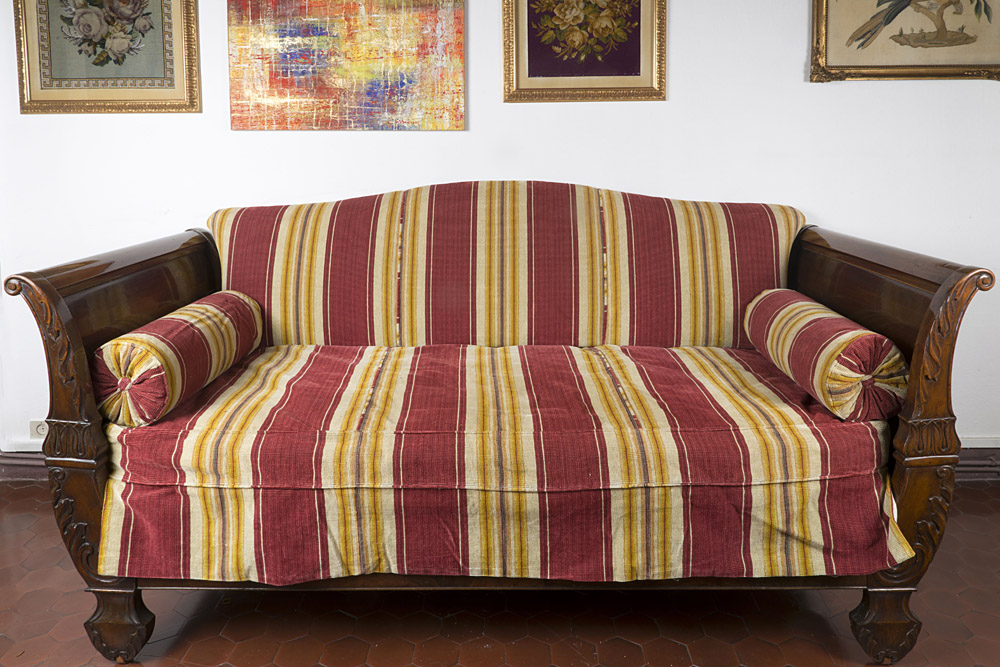 Divano da parete in noce con montati mossi e intagliati a volute fogliate e riccioli.Piedi sagomati. Sec. XIX (cm 214) (difetti e mancanze) Walnut wood sofa. 19th century (defects and losses)