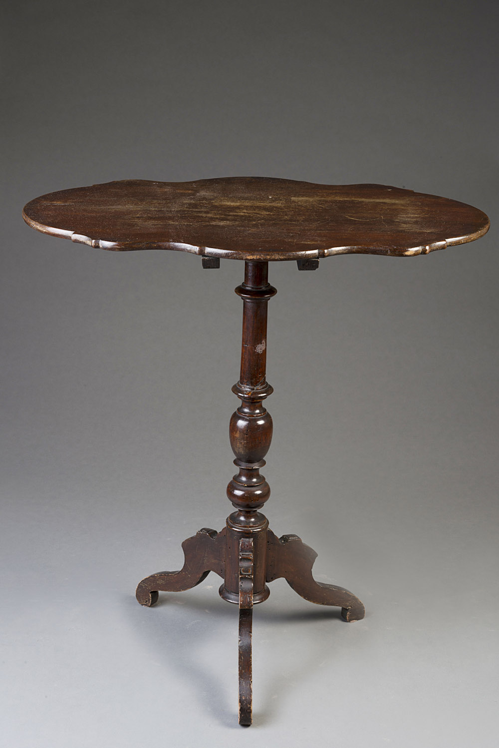 Tavolino a vela in mogano con piano sagomato, poggiante su gamba centrale tornita terminate a tre piedi sagomati (cm 67x70x45) Mahogany shaped tilt-top table