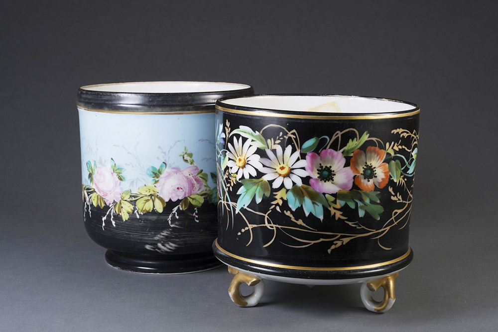 Manifatture diverse. Lotto composto da due cachepot in porcellana nera e azzurra decorata in policromia a fiori, uno con piedi traforati a finti rami. Various manufactures. Lot comprising two porcelain jardinières