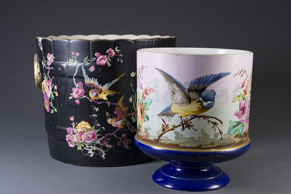 Manifatture diverse. Lotto composto da un cachepot in porcellana policroma con fiori e uccelli ed un rinfrescatoio in ceramica nera (misure diverse)(gravi difetti) Various manufactures. Lot comprising a porcelain polychrome jardinière and a ceramic cooler (different measures) (major defects)