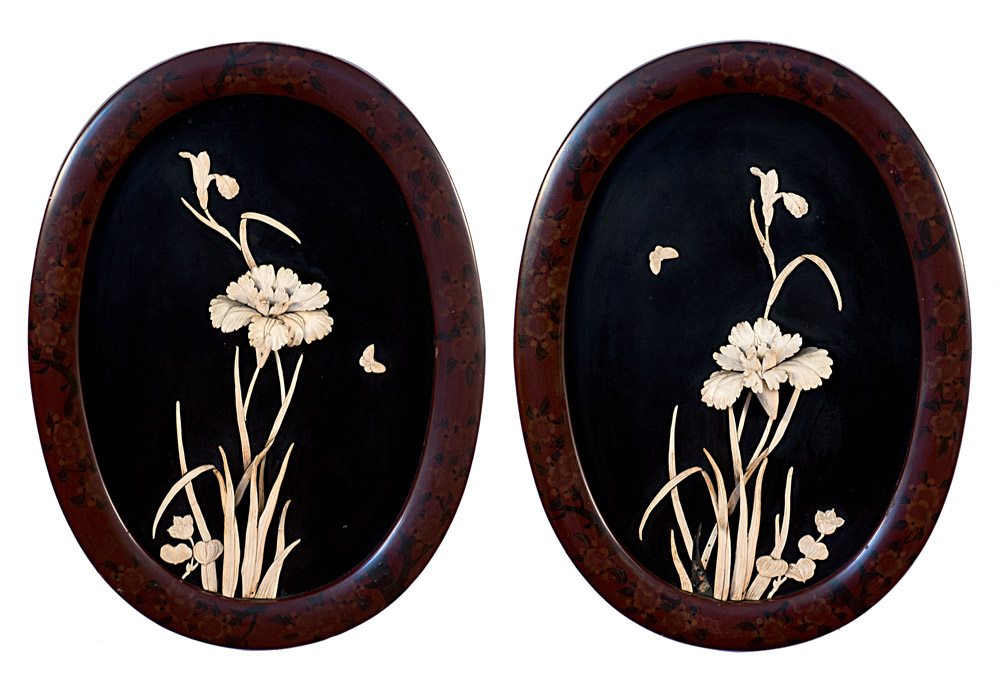Arte giapponese Meiji fine sec. XIX Coppia di pannelli ovali in lacca nera decorati con applicazioni in avorio scolpito in rilievo a fiori e a farfalle. In cornici(difetti e mancanze) (cm 55x38) Meiji Japanese art, late 19th century. Pair of black lacquered oval panels (defects and losses)