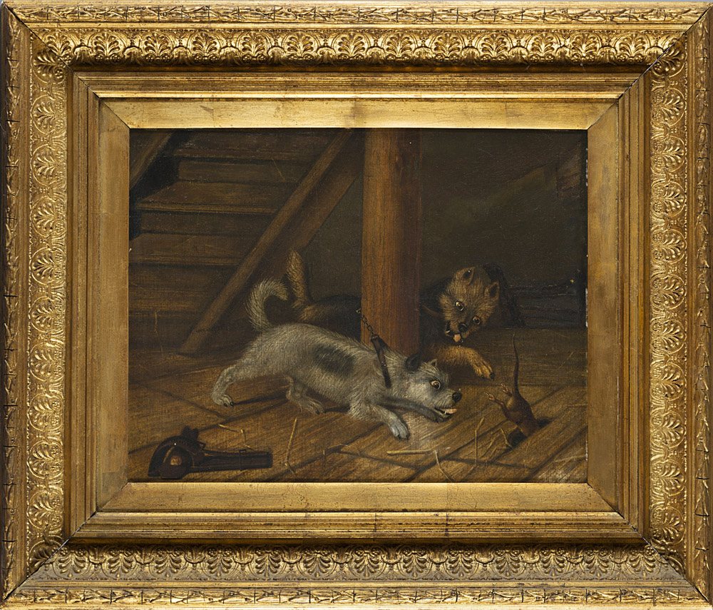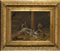 Scuola del sec. XIX 'Caccia al topo' olio su cartone pressato (cm 38x49). In cornice di legno e pastiglia dorata School of the 19th century "Mousehunt" oil on pressed cardboard. Giltwood frame