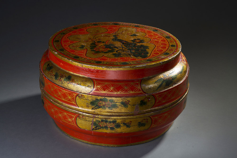 Manifattura orientale. Scatola di forma circolare in legno laccato decorato a paesaggi e animali su fondo dorato (h cm 22xdiam. cm 40) Oriental manufacture. Round lacquered wood box