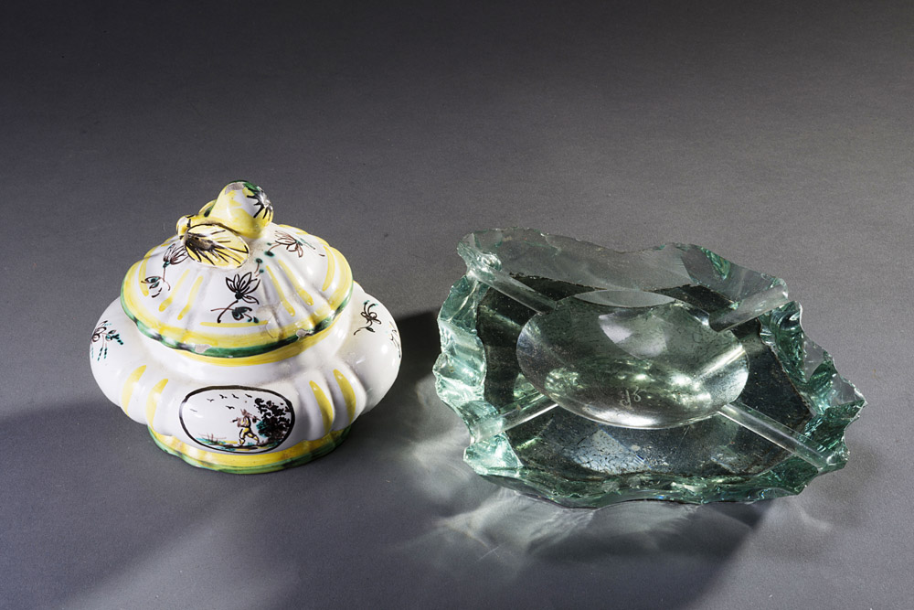 Lotto composto da un posacenere in cristallo attribuito a 'Fontana Arte' ed una piccola zuppiera in ceramica marcata W.M. Albisola Lot comprising a glass ashtray attributed to Fontana Arte and a small ceramic soup tureen marked W.M. Albisola