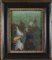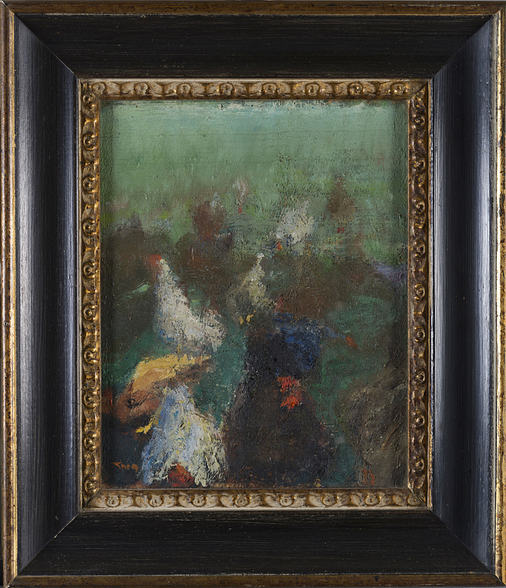 Firma indecifrata 'Galli e galline' olio su tavoletta (cm 23x18) firmato in basso a sinistra in cornice di legno ebanizzato e dorato Undeciphered signature "Cocks and Hens", oil on board, signed at bottom left. Ebonized and giltwood frame