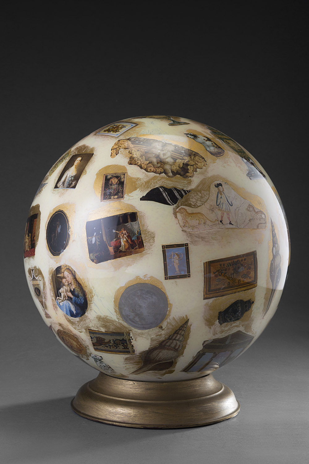 Elemento decorativo di forma sferica in vetro soffiato decorato a decoupage a figure e oggetti d'arte su fondo crema con dorature e poggiante su base in ottone (h cm 30) Round blown glass decorative element on brass base