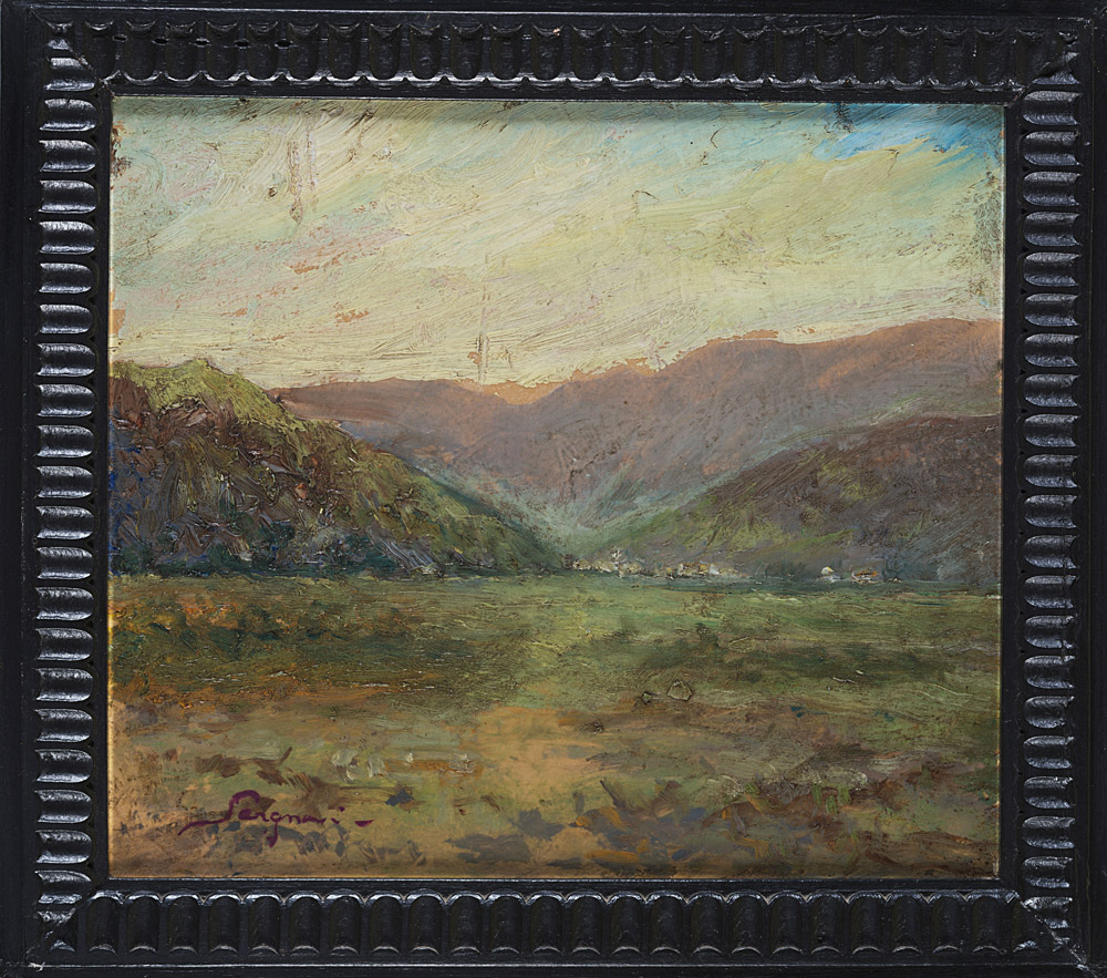 Ferniani (?) 'Paesaggio montano' olio su compensato (cm 21x24) firmato in basso a sinistra. In cornice intagliata ed ebanizzata (difetti) Ferniani (?) "Mountain Landscape" oil on plywood, signed at bottom left. Ebonized carved frame (defects)