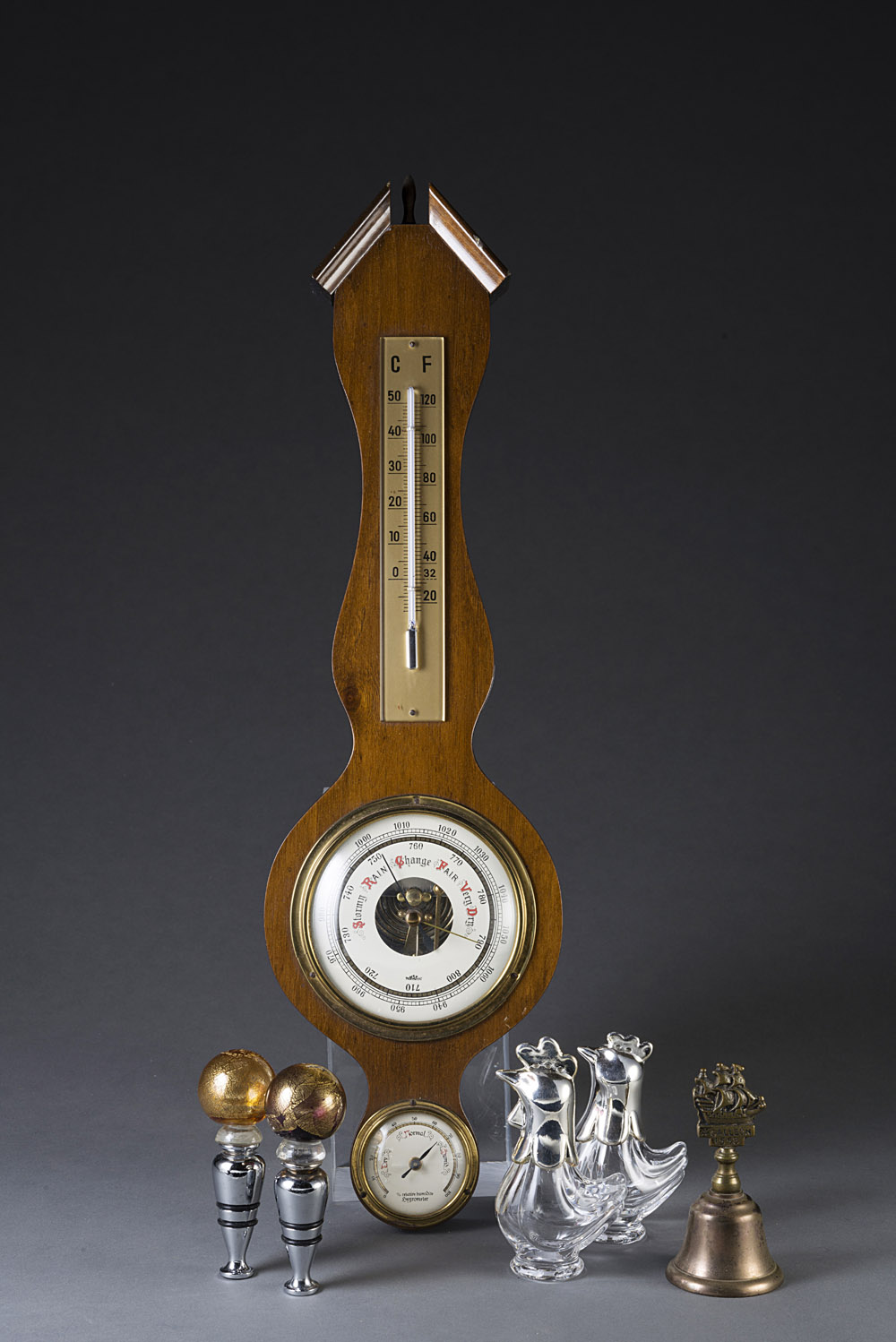 Lotto composto da un porta sale e pepe a forma di galli, due tappi per bottiglie in metallo e vetro, una campanella e un barometro/termometro da muro Lot comprising a salt and pepper shaker, two metal and glass bottle tops, a bell and a wall barometer