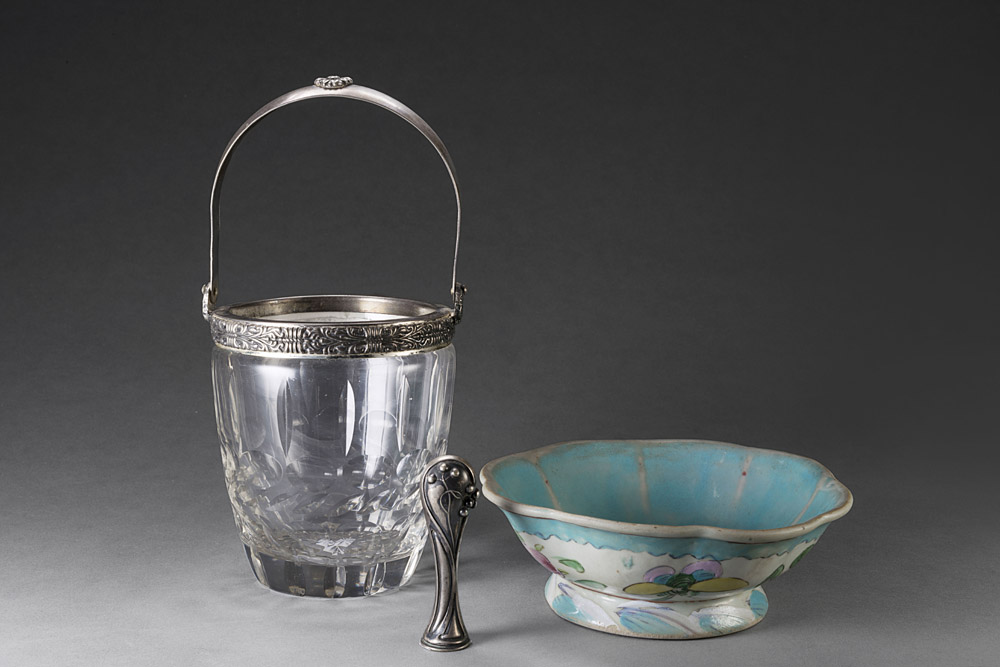 Lotto composto da una ciotola cinese, un porta ghiaccio in metallo argentato...