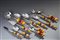 Parte di servizio di posate in metallo argentato con prese decorate a perlinature policrome composto da trentuno forchette, quarantotto coltelli, diciannove cucchiaini, venticinque coltelli da frutta, trentacinque cucchiai, trentacinque forchette da frutta/dessert e ventitrè posate da portata (difetti) Silver-plated part flatware service comprising thirty-one forks, forty-nine knives, nineteen coffee spoons, twenty-five dessert knives, thirty-five spoons, thirty-five dessert forks and twenty.three serving flatware (defects)