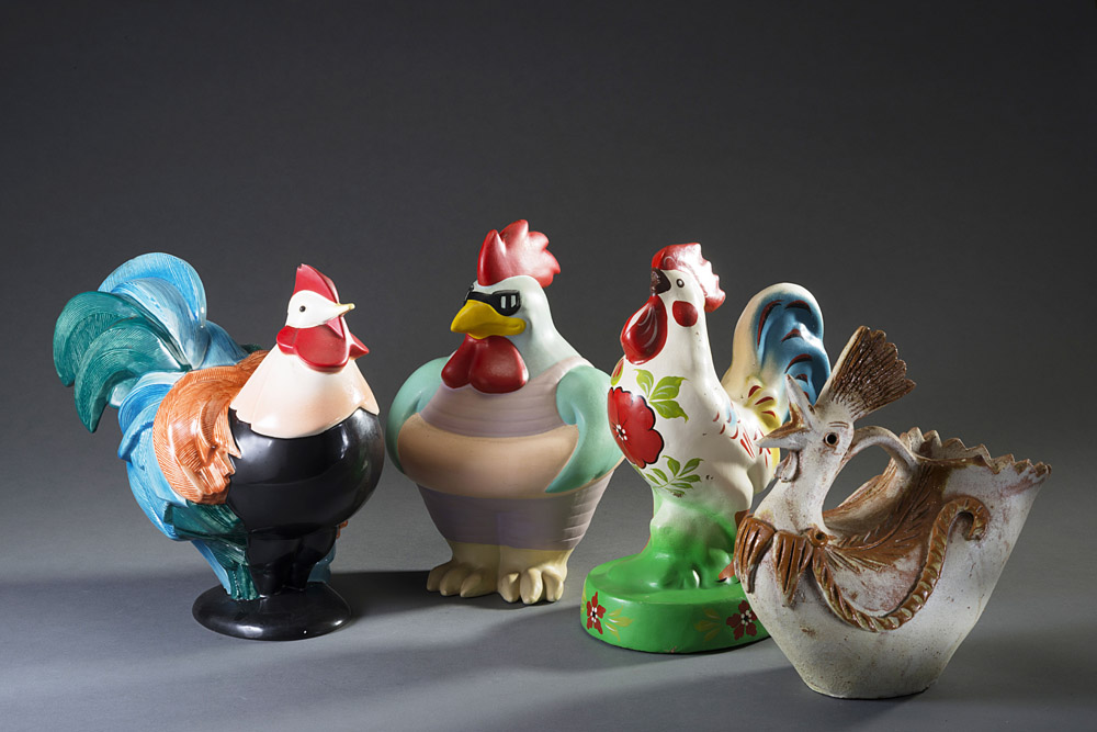 Lotto composto da quattro statuette di diversa forma e misura raffiguranti galli (difetti e mancanze) Lot comprising four different statuettes of different shapes and sizes representing cocks (defects and losses)
