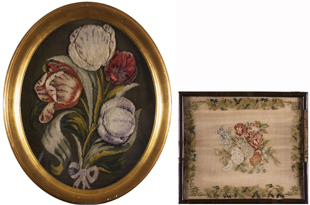 Lotto composto da due ricami, uno di forma ovale, l'altro rettangolare raffigurante fiori (misure diverse) In cornici (difetti) Lot comprising two embroideries (different measures) Framed (defects)