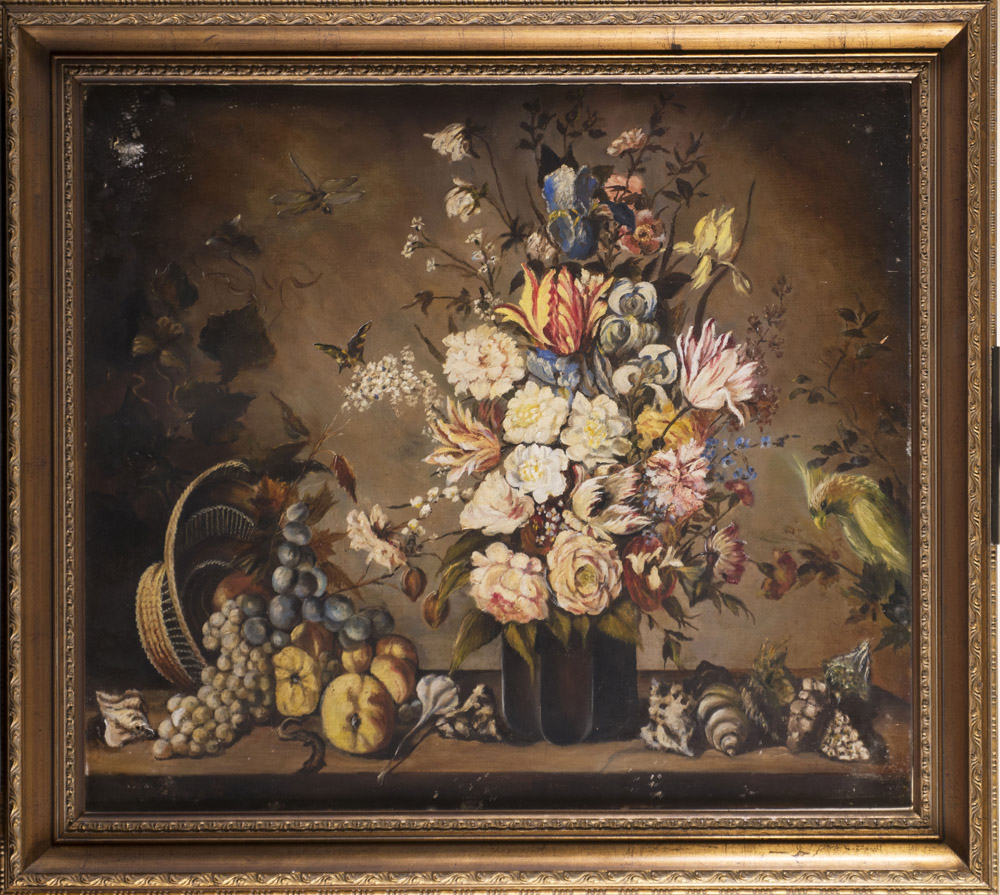 Scuola della fine del sec. XIX 'Composizione con fiori, frutta e animali' olio su cartone telato (cm 64x65) in cornice (difetti) School of the late 19th century "Fruit, Flowers and Animals" oil on canvas backed cardboard. Framed (defects)