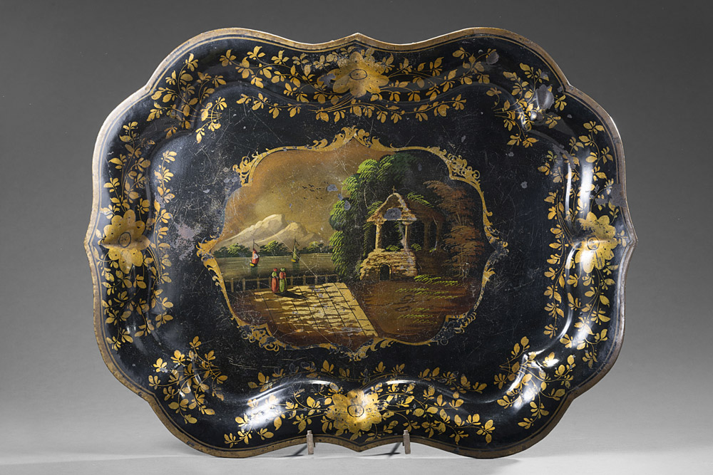Vassoio di forma sagomata in tôle peinte decorato nel bordo a fiori e foglie dorate e nel cavetto in policromia a paesaggio lacustre con figure. Sec. XIX (cm 57x93)(lievi difetti) Shaped tôle peinte tray. 19th century (minor defects)