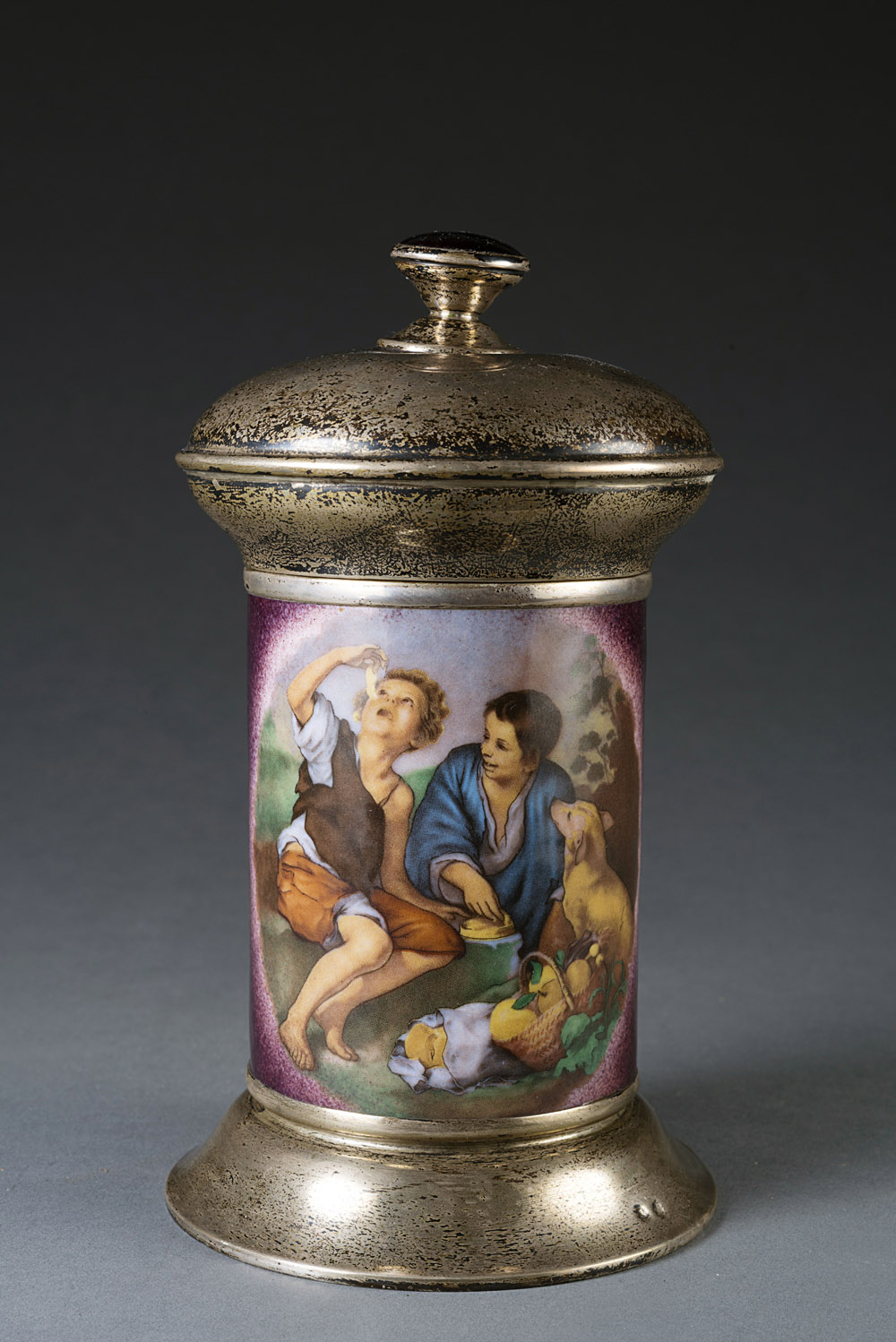 Scatola portasigarette in smalti policromi raffiguranti fanciulli. Coperchio in argento (h cm 20) (difetti) Enamelled silver cigarette case (defects)