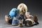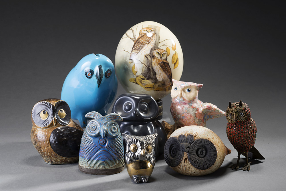 Lotto composto da nove oggetti in materiali diversi raffiguranti gufi (difetti) Lot comprising nine owl objects in different materials (defects)