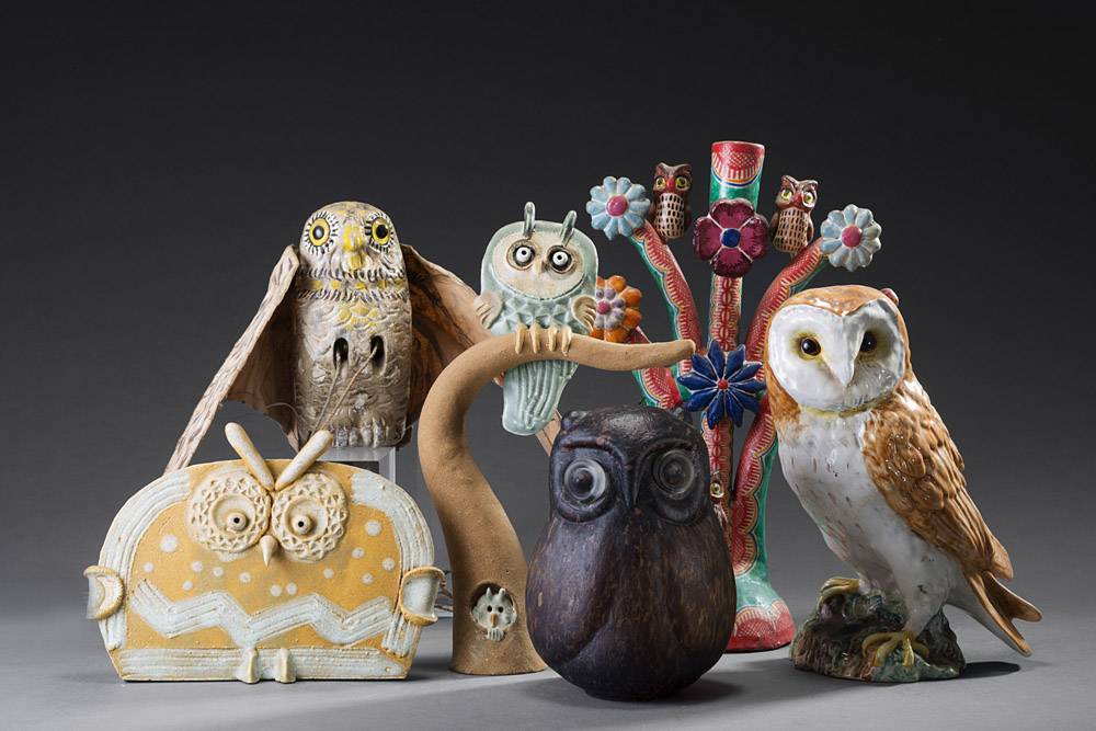 Gruppo di sei statuette raffiguranti gufi in materiali diversi (difetti) Lot...