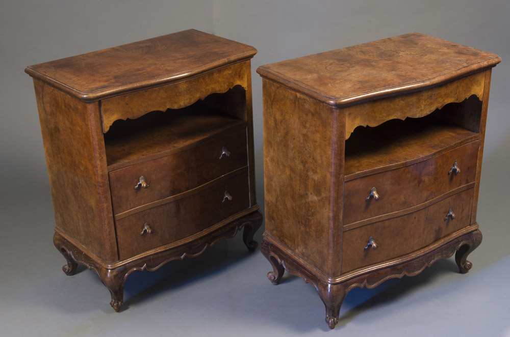 Coppia di comodini di forma sagomata a tre cassetti di cui uno sottopiano; gambe a fascia mosse ed intagliate (cm 64x75x40) Pair of bed-side tables