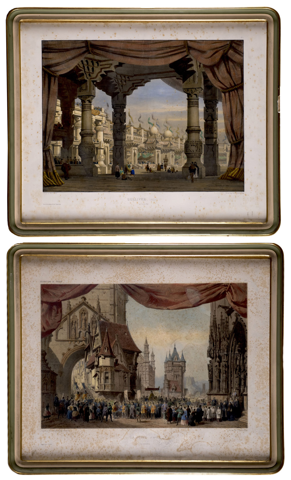 Coppia di litografie a colori raffiguranti rappresentazioni teatrali (cm.48X58)Francia sec.XIX. In cornici (difetti) Pair of colour lithographs of theatrical performances. France, 19th century. Framed (defects)